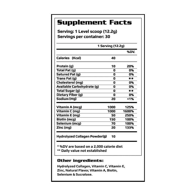 Colageno Hidrolizado, Vitamina C, Vitamina E, Zinc, Sabor Natural, Vitamina A, Biotina, Selenio, Sucralosa.