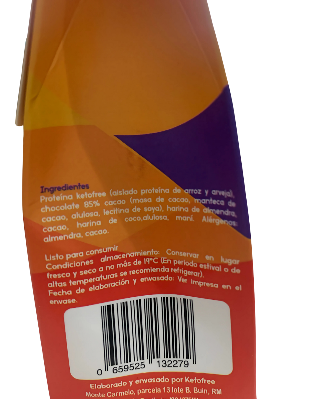 Aislado de proteína de arroz y arveja, chocolate 85% cacao (masa de cacao, manteca de cacao, alulosa, lecitina de soya), harina de almendras, cacao, harina de coco, alulosa, maní.