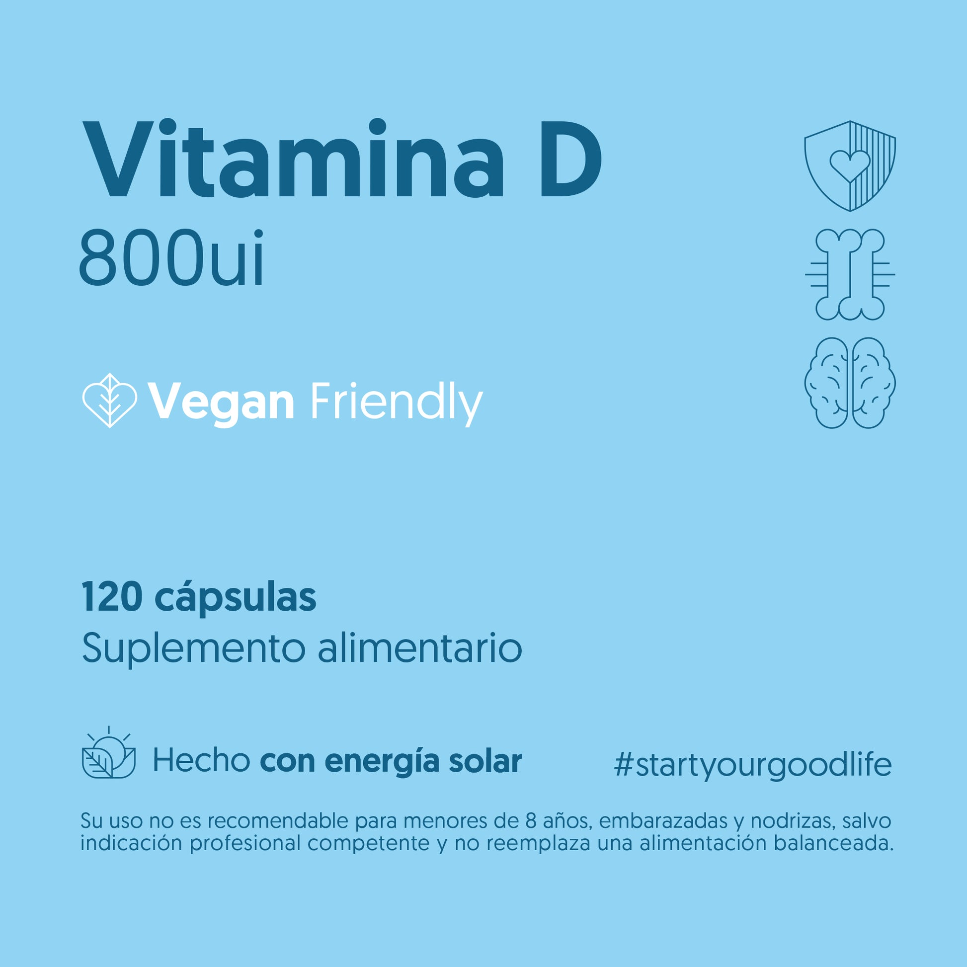 - Vitamina D3 (Colecalciferol): 20 mcg (800 UI) — 400% del Valor Recomendado.